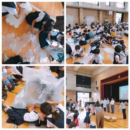 体育館にて2年生の学年レクリエーションをしました。皆様もご存じである、プチプチを製造されている川上産業さんにお越しいただき公演して頂きました。
