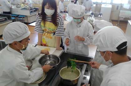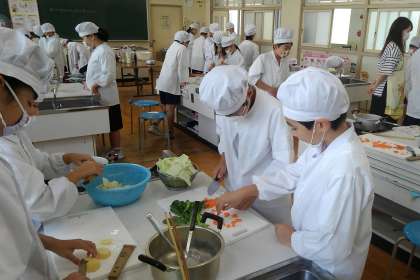 今回の調理実習では、グループで協力して「ゆで野菜サラダ」を作りました。