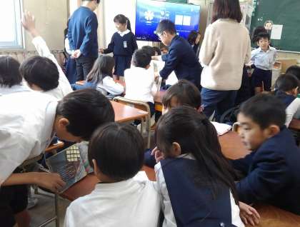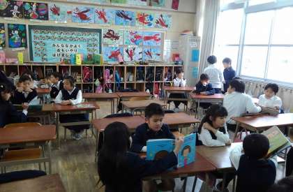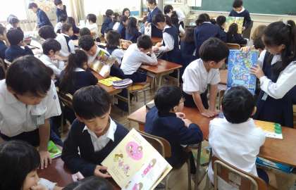 今回は、4年生が2年生の教室に行って、絵本の読み聞かせをしました。