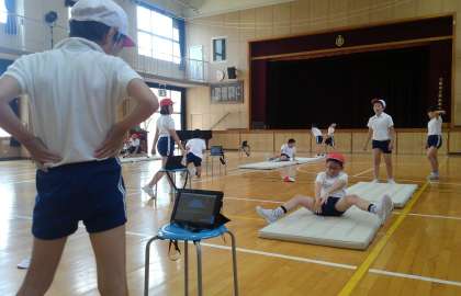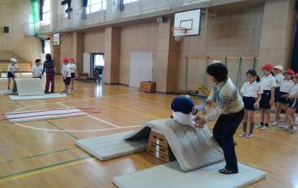 跳び箱では、恐怖心を少しでも和らげるようマットを敷きながら、台上前転をしています。
