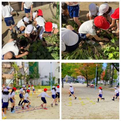 「サツマイモ掘り」では、一学期に植えたサツマイモの苗を掘りました。途中で根が切れないのように慎重に手で掘りおこしました。土の中からサツマイモが見えた時は子どもたちも嬉しそうにしていました。