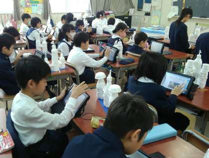 白い紙ねんどを、こねては伸ばし、こねてはくっつけ.....子どもたちは、ペットボトルに粘土を貼り付けています。