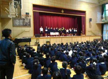 先日の児童朝会では、5・6年生の委員会の児童が中心となり、給食感謝の会を行いました。