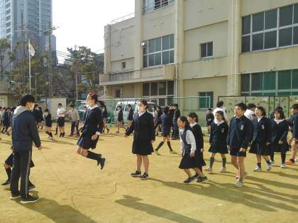 低・中・高学年別に、めあてを定め、クラスみんなで長縄を跳んでいます。どの学年も白熱しており、その結果に一喜一憂していました。