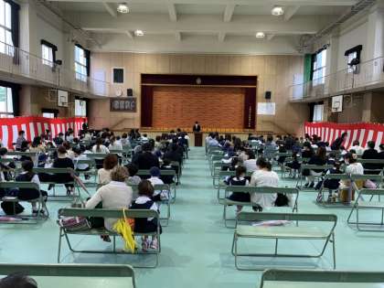 入学オリエンテーションが、講堂で行われました。天候が悪く、雨天の中、保護者同伴で1年生の子どもたちが登校しました。少し緊張した顔の子どもたちだったように思います。