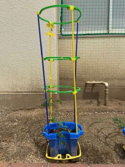 先しゅう、みんなでうえたミニトマトのなえのようすをおしらせします。ミニトマトが大きく、まっすぐそだつようにしちゅうを立てました。前のとう校日でうえた時より、すこし大きくなっているような気がします。もうすでに、花がさいているお友だちもいます!びっくりですね。今しゅうのとう校日に、どのようにせい長しているか、みんなでかんさつしましょうね。
