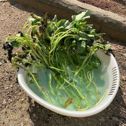 2年生は、ミニトマトのほかにさつまいものかんさつもあります。しゃしんは、うえる前のなえですが、今は、学校のはたけにうえています。ミニトマトといっしょにかんさつしましょう。