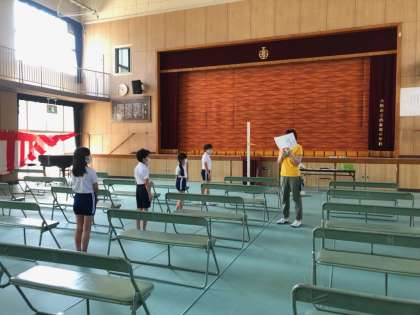 今日は、Aグループの発育測定でした。身長と体重の計測です。間隔をあけるために保健室ではなく、広い講堂で実施しました。例年は4月に計測していますが、今回は2か月遅れの計測だったので、思ったより成長していると感じる児童が多かったようです。