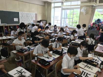 7月1日(水)に習字をしました。4年生になって初めての習字です。久々の習字で、筆が固まっているのをほぐしたり、習字道具の置き場所をどこにするか戸惑ったりしている姿が見られました。子どもたちは字の特徴を調べ、集中して取り組んでいました。