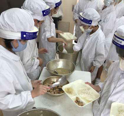 今日の給食は、ごはん・お味噌汁・さけのつけ焼き・とうがんの煮物でした。チャイムが鳴ったら、着替えてフェイスシールドを装着!!自分たちなりに段取りを考えて、上手に配膳ができるようになってきました。