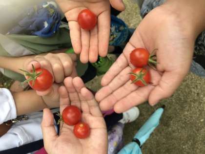 今日が初めての収穫だった子は、「うわあ、真っ赤」「美味しそう」と大興奮!!以前に収穫ができていた子は、「夕ごはんのサラダに入れてもらった」「4人家族だから1人1個食べれたよ」と話していました。