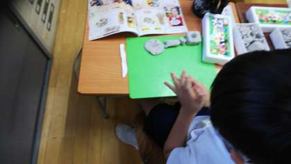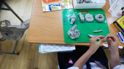 ずがこうさくの じかんに、あぶらねんどを つかって、ごちそうパーティーを はじめよう という がくしゅうを しています。
