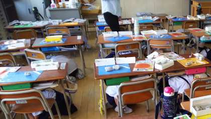 まず、てじしんがおきて、つくえのしたに もぐりました。