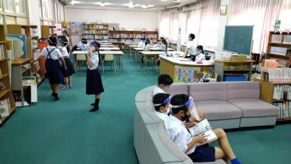 ただ、混雑が予想されるので、図書室に来てもいい学年を曜日・時間ごとに指定したり、フェイスシールドを着けたりして対策しています。