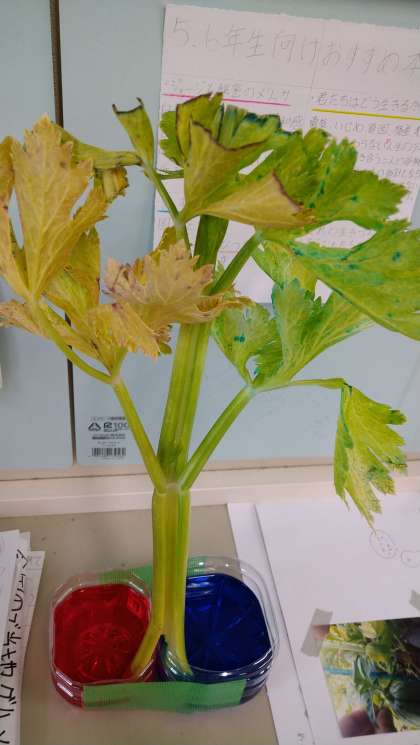先週の「吸い上げた水の通り道」の実験で使った、植物(赤と青の食紅の水)ですが・・・違いが分かるくらいに、葉の色が変わってきました!