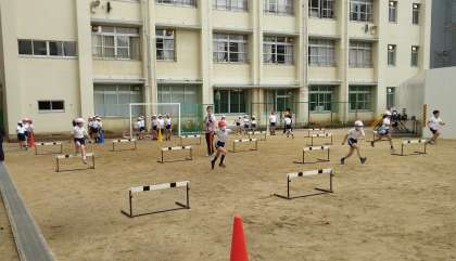 運動場では、ハードルやなわとび、体育館ではマット運動に取り組んでいます。