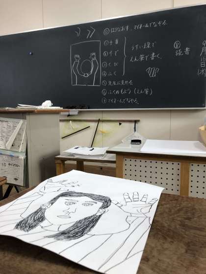今日は、顔や手の配置を考えて、自分の顔を描きました。