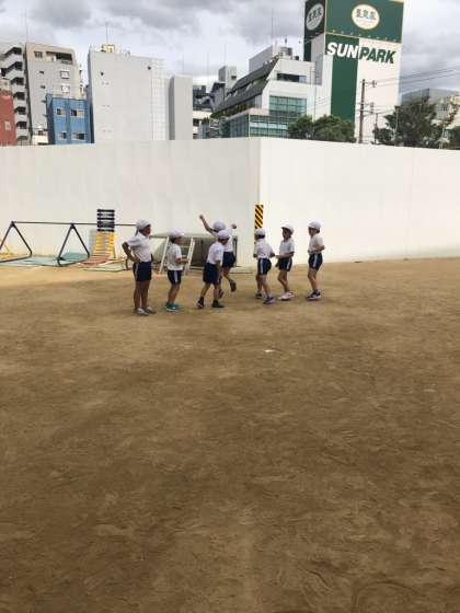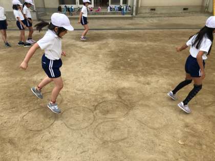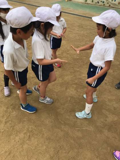 今日は、外で「ケンパ」をしました。片足でバランスを保ちながらリズムよく前に進む...これが意外と難しい様子で、枠から横にはみ出たり、リズムよく進むことができなかったりと苦戦していました。