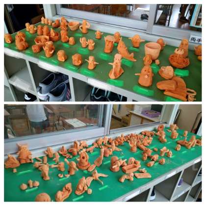 棚に並べてある「はにわ」たちが徐々に乾いて、少し白っぽく固まってきました。