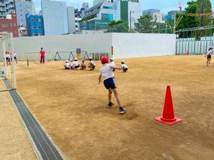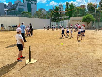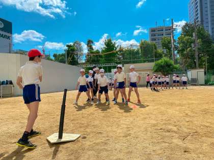 体育では、ティーボールをしています。ポールにボールを乗せ、手でボールを打つ野球やソフトボールに極めて類似したボールゲームです。どうやって打てばボールが遠くに飛ばすことができるのかチームで考えながら、多く点数が取れるように計画を立てて楽しく活動してました。