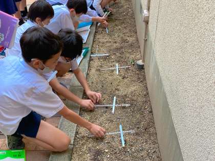 日なたと日かげの温度はどれくらい違うのか?温度計をもって運動場に出て、日光が当たっている日なたと校舎のかげになっている日かげでは、温度はどれくらいなのか調べました。正午に調べると、日なたと日かげで10度以上差があり子どもたちも驚いていました。