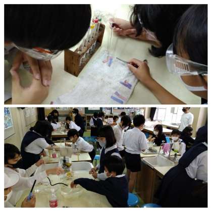 適宜、マスクやフェイスシールドを着けて、理科の実験や音楽の歌唱にも取り組んでいます。写真は、炭酸水や食塩水などの水溶液・リトマス紙に関する実験で、みんなワクワクが止まらないようです。
