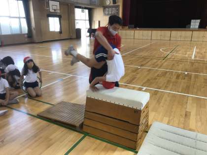 10月末〜11月中旬にかけて、インストラクターの方に来ていただき、跳び箱運動をしています。跳び箱が得意な人も、得意でない人もみんなが楽しめるように指導していただきました。跳び箱に走りこんでくる真剣な顔は輝いていました。
