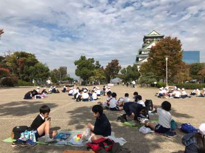天守閣を見ながら、お待ちかねのお弁当タイムです。