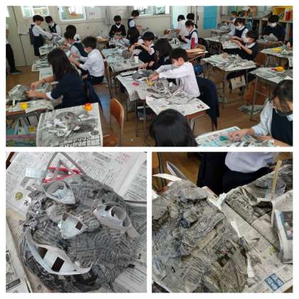 どのクラスも少しずつ時間を見つけながら、細長い厚紙を組み合わせ、お面の骨格が完成されつつあります。