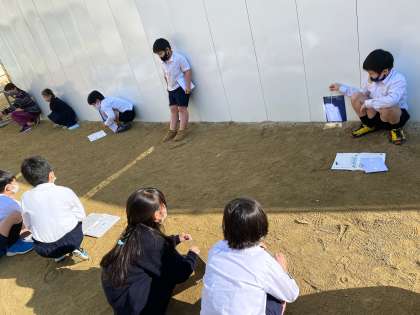 理科では、鏡を使って太陽の光を反射させ、暗い画用紙に光を集めた時の温度や明るさはどのように変化するのか実験しました。鏡が1〜3枚に増やしていくと、温度計の温度は高くなっていき、明るさは、明るくなっていくことを学習しました。子どもたちも興味津々に実験に取り組んでいました。
