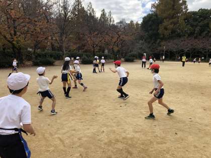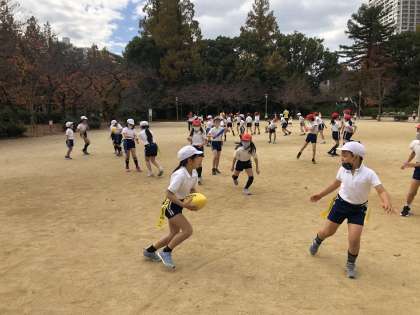 3年生は昨日、体育でタグラグビーを行いました。初めてタグラグビーをする子が多かったので、最初はルールに戸惑っていましたが、終盤ではチームで協力して上手に攻めたり、守ったりしていました。