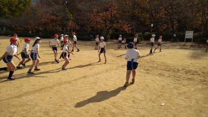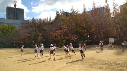 しかし、思わずボールを、前の方に向かってパスしてしまうところがとても難しいようです。これからゲームを通して、パスの仕方・もらい方などを体感しながら学んでいきます。