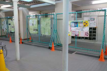 現在、学期末懇談会と作品展が行われていますが、1階のピロティには5・6年生による、委員会活動の報告をポスター形式にして掲示しています。