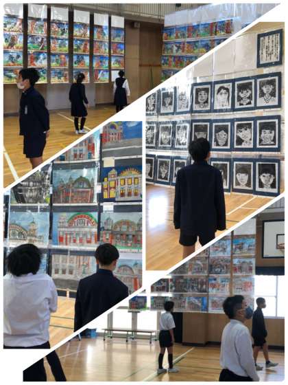 子どもたちはそれぞれの学年の作品のよいところを見つけながら真剣に鑑賞していました。
