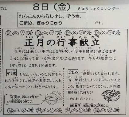 いつも、給食委員会の皆さんが放送してくれています。各クラスにある献立表にも「正月の行事献立」のコラムとともに、雑煮やごまめの紹介も載ってあります。