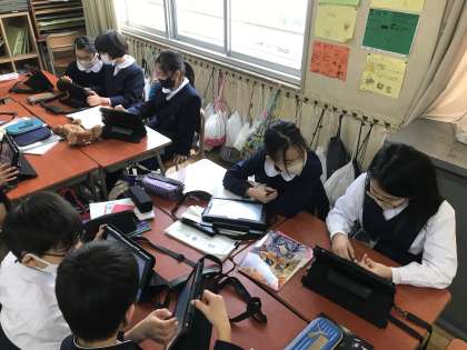 今、国語では各班で独自のアンケートを実施し、タブレットを使ったり、表やグラフにまとめたりしてアンケート結果から考えられることについて発表の準備をしています。自分たちで考えるアンケートを行い、集計をとることが楽しいみたいで、積極的に活動に取り組んでいます。