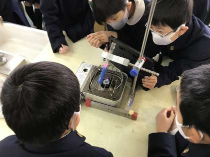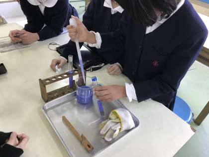 今日の理科実験は「水のあたたまり方」について実験をしました。前回の金属のあたたまり方と違い、理科っぽい実験道具である試験管やビーカーを使うということで子どもたちの気持ちも前向きでした。あたたまると色が変わるインクを使って水のあたたまり方を可視化して、子どもたちも驚きながら変化の様子を見ていました。
