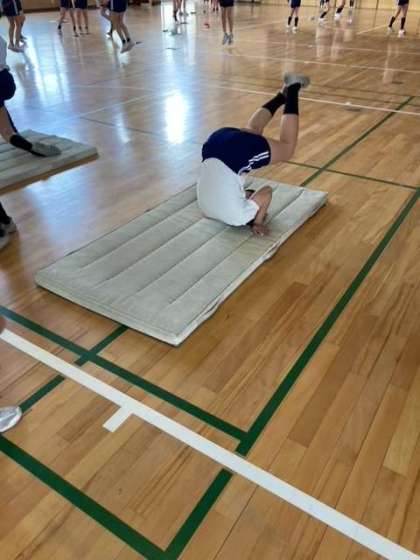 前転は手の着く位置、後転はお尻の着く位置などに気をつけて練習しています。
