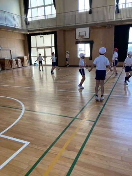 いま4年生は、講堂での体育では、なわとびとマット運動をしています。
