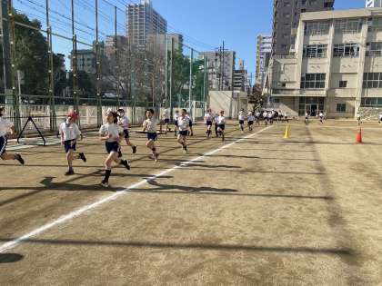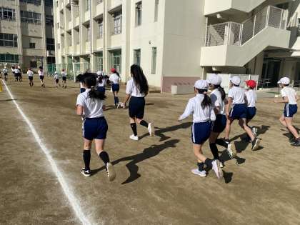 体育の日には毎時間かけ足をしています。音楽に合わせて、自分のペースで運動場を走ります。