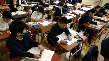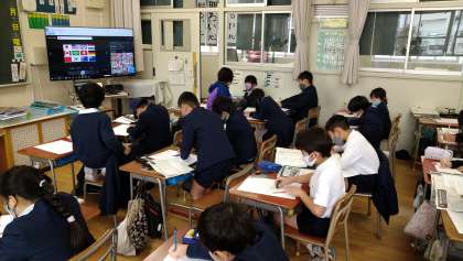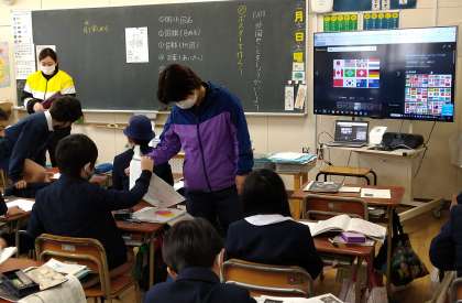 前回の単元では住んでいる“家”を通して、「世界の国のこと」を少し学んだ3年生たちは、今度はそれぞれの国について調べ、ポスターにまとめる学習をしています。