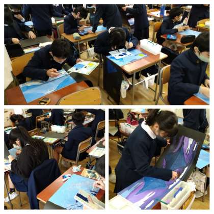 社会科でも学んできた「浮世絵」をパソコンで選ぶところから始まり、細かいところまで下書きをし、版画の板を彫刻刀で丁寧に彫っていき、最後に絵の具で彩色し、黒い画用紙に写し取りました。