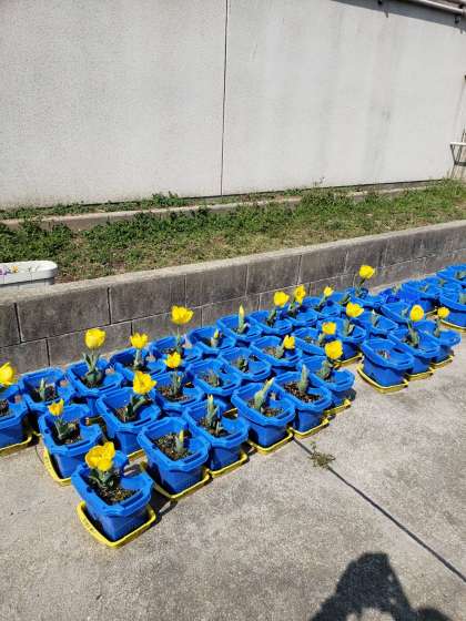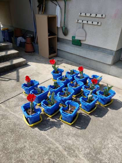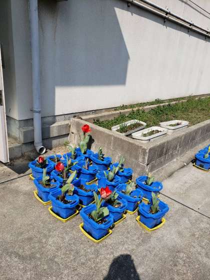 あきにうえたチューリップがきれいにさきました。クラスによっていろがちがってとてもうつくしいです。まい日、一生けんめいおせわしたので、チューリップもすくすくのびのびそだっています。まださいてないチューリップも、これからさいてくるので、水をあげたり、草をぬいたりして、大せつにそだてていきます。