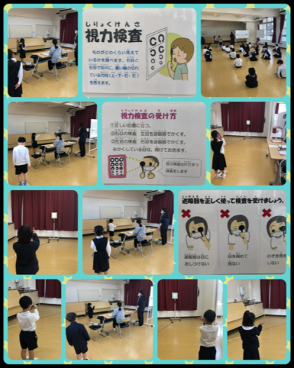 養護教諭の池田先生から視力検査の受け方の説明をしてもらい、順番に視力をはかりました。