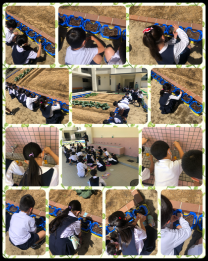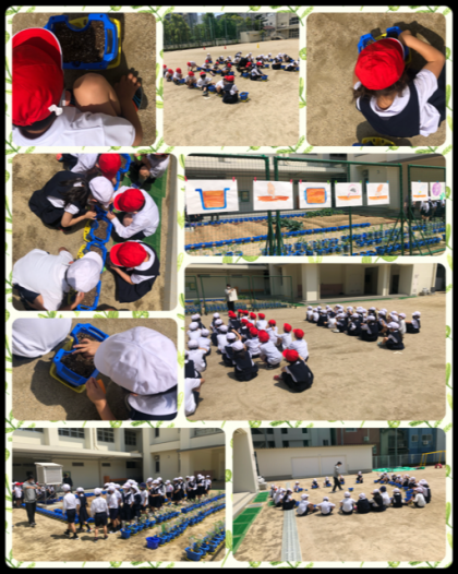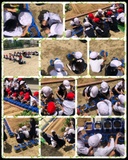 昨日は1クラスが種まきをし、今日は来週から雨模様なので、3クラス合同で種まきをしました。