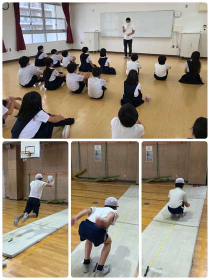 体育の学習では、体力テストをしています。今週は立ち幅跳びを計測しました。腕を振って、なるべく遠くへ・・・ジャンプ!