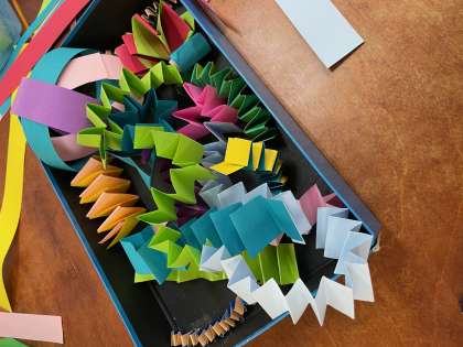 まずは自分の頭の大きさに合ったぼうしを作ります。次に、細く切った画用紙を、バネのように折ったり、切ったりして、自分だけの飾りを作っていきます。