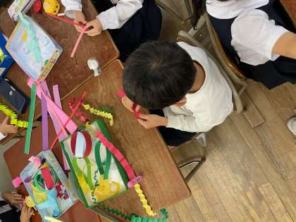 作業が始まるととても真剣な表情で学習をしています。「あ!〇〇さんのこの飾りがとても素敵だね!」と、お友達のいいところも見つけながら学習を進めています。