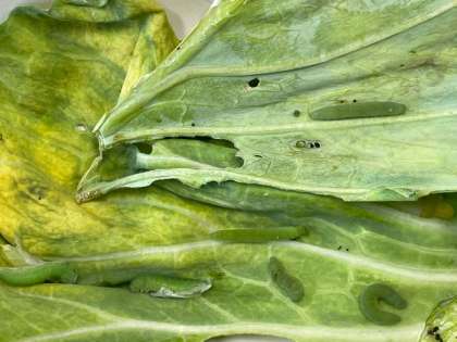 学習園のキャベツにモンシロチョウが卵を産み、たくさんの幼虫を見つけました。