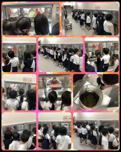 1年生が1クラスごと、調理している時間に合わせて、給食室の見学をしています。